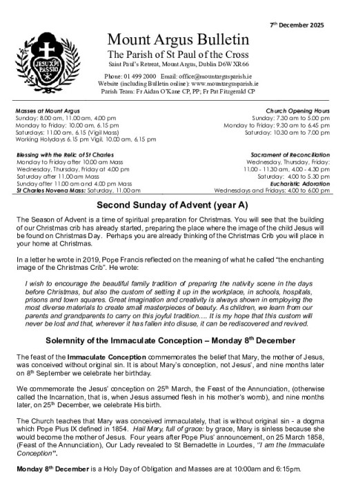 Saint Charles of Mount Argus was born John Andrew Houben on December 11, 1821 in the village of Munstergeleen, Holland.  In 1841, he was enrolled for military service and while in the army, he heard of the Passionists and decided to join them.  With the military service completed in 1845, Andrew joined the Passionists Read more ...